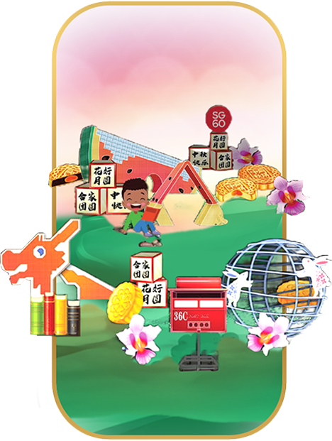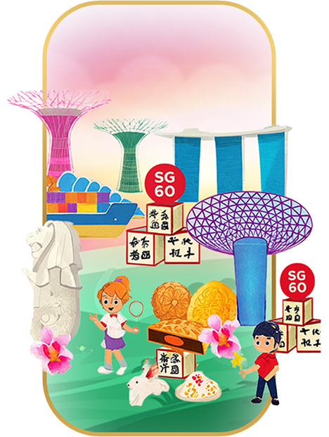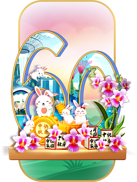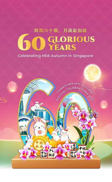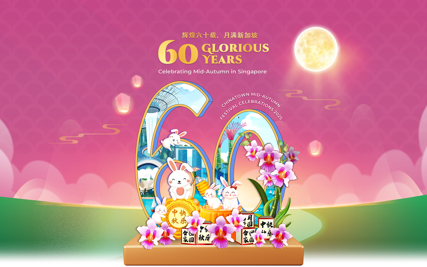 At the heart of Chinatown stands a striking 8-metre-tall centrepiece—a sculptural tribute to SG60. The bold “60” at its core, set against the backdrop of the Singapore skyline, symbolises the nation’s journey of growth and progress. Surrounding the structure are motifs of rabbits, mooncakes, traditional lanterns, and vibrant orchids, forming a vivid tableau that honours both cultural heritage and contemporary pride. More than just a festive display, this towering installation embodies Singapore’s remarkable transformation and the enduring spirit of resilience passed down through generations.